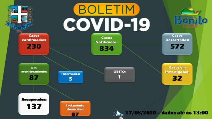 Boletim epidemiológico da Secretaria Municipal de Saúde desta segunda-feira (17) mostra que Bonito já registrou 834 notificações de casos suspeitos de coronavírus e que destes, 230 testaram positivo para o Covid-19.