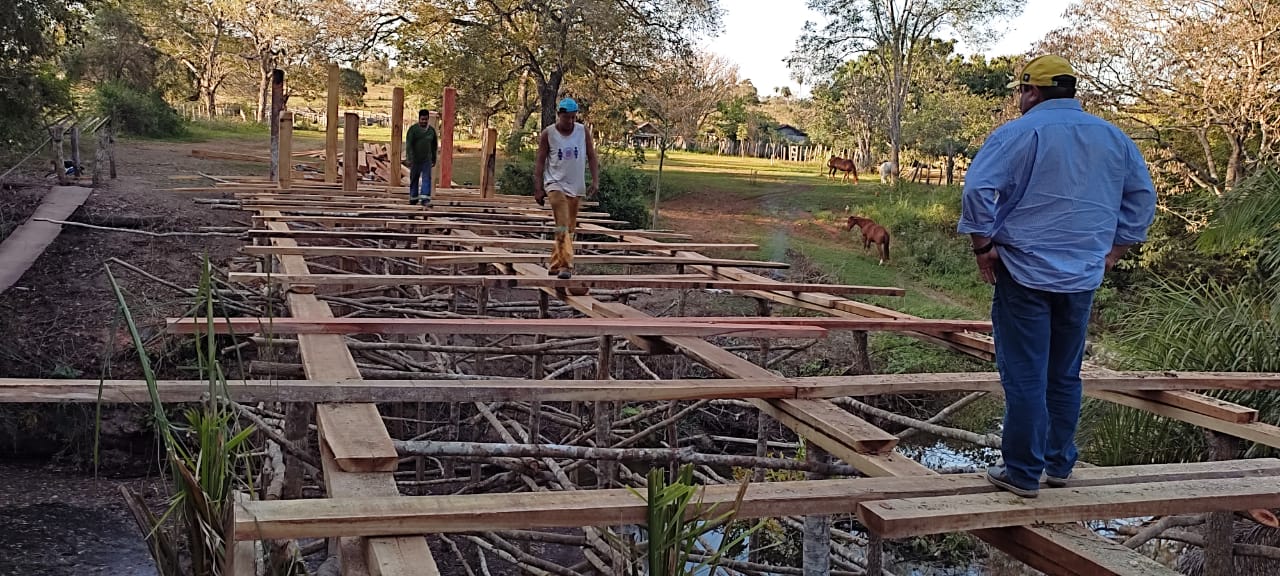 A ponte de madeira está sendo construída em vigamento simples armado, pela Construtora Santa Terezinha.