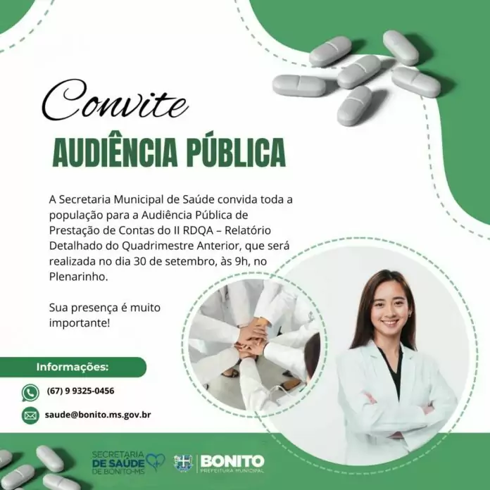 A Prefeitura de Bonito, por meio da Secretaria Municipal de Saúde, convida a população para participar da Audiência Pública de Prestação de Contas referente ao II RDQA – Relatório Detalhado do Quadrimestre Anterior.