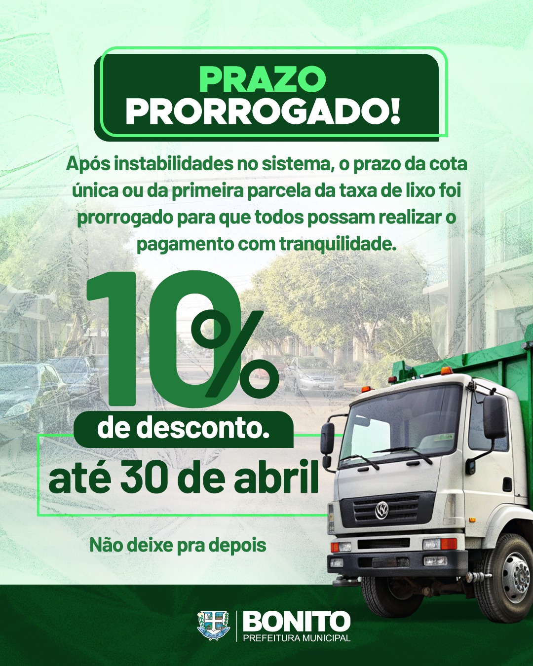 A Prefeitura de Bonito publicou o Decreto nº 124, de 10 de abril de 2026, que altera o calendário de vencimento da Taxa de Coleta, Tratamento e Disposição Final de Resíduos Sólidos referente ao exercício de 2026.