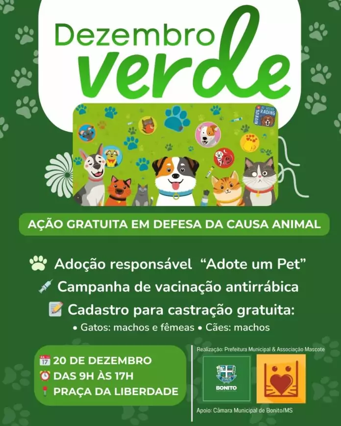 No dia 20 de dezembro, será realizada em Bonito uma ação em defesa da causa animal, dentro da campanha Dezembro Verde. O evento acontece na Praça da Liberdade, das 9h às 17h, e contará com diversos serviços gratuitos voltados ao bem-estar animal e à conscientização da população.