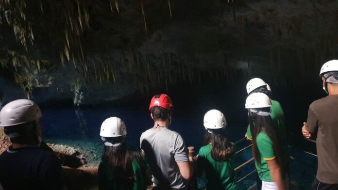 Em mais uma ação do Projeto de Educação Ambiental de Bonito, na quinta-feira (8), a Secretaria de Meio Ambiente acompanhou os jovens e crianças do 6º da Escola Municipal Profª Durvalina Dornelles Teixeira em uma visita na Gruta do Lago Azul, atrativo gerido pela Prefeitura de Bonito e principal cartão postal da cidade.